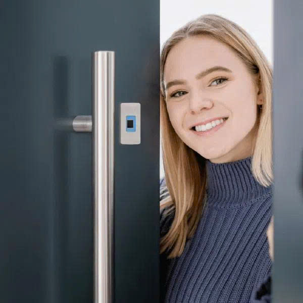Cảm biến vân tay tích hợp vào thân cửa hoặc tay cầm (“door leaf / handle”) — thiết kế sang trọng, hạn chế lộ thiết bị bên ngoài.